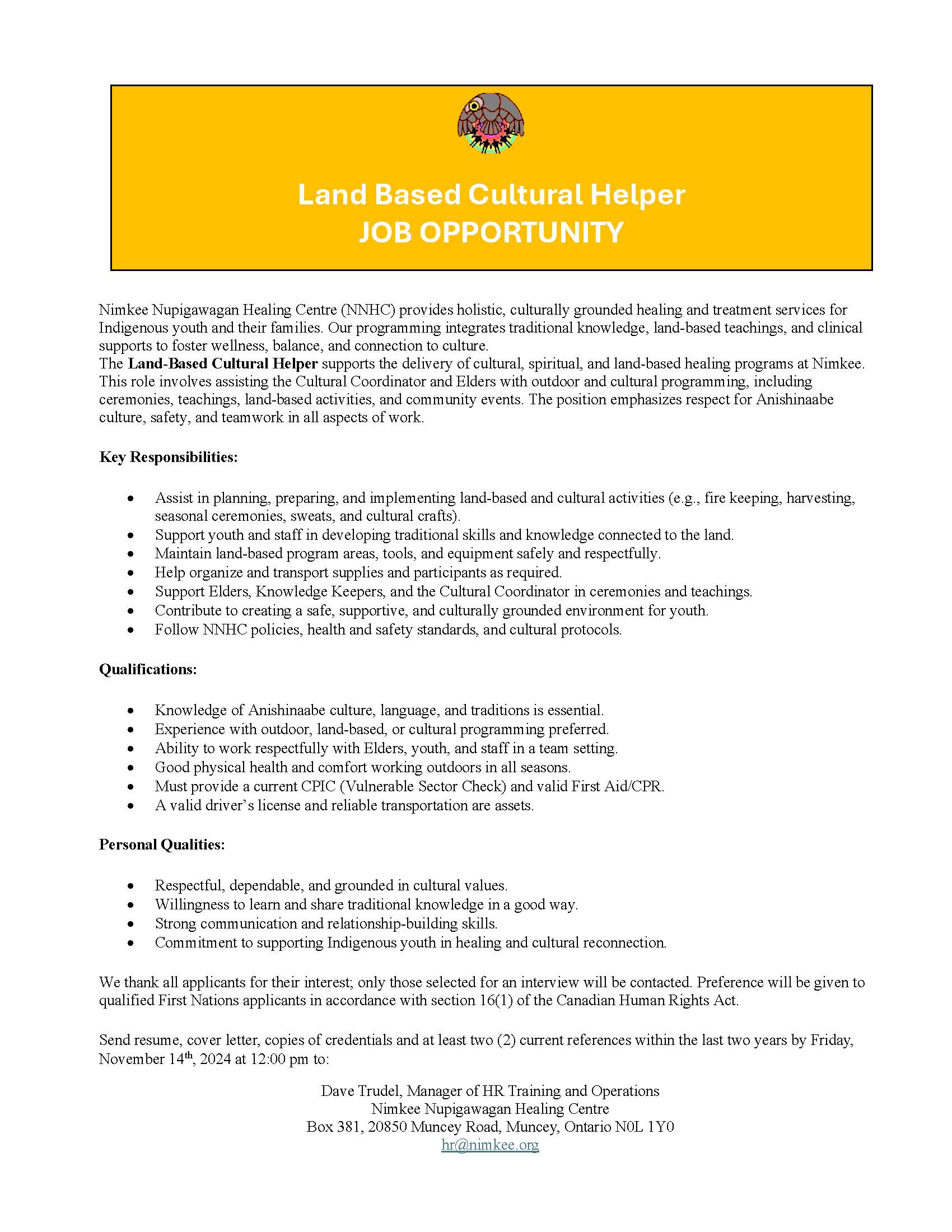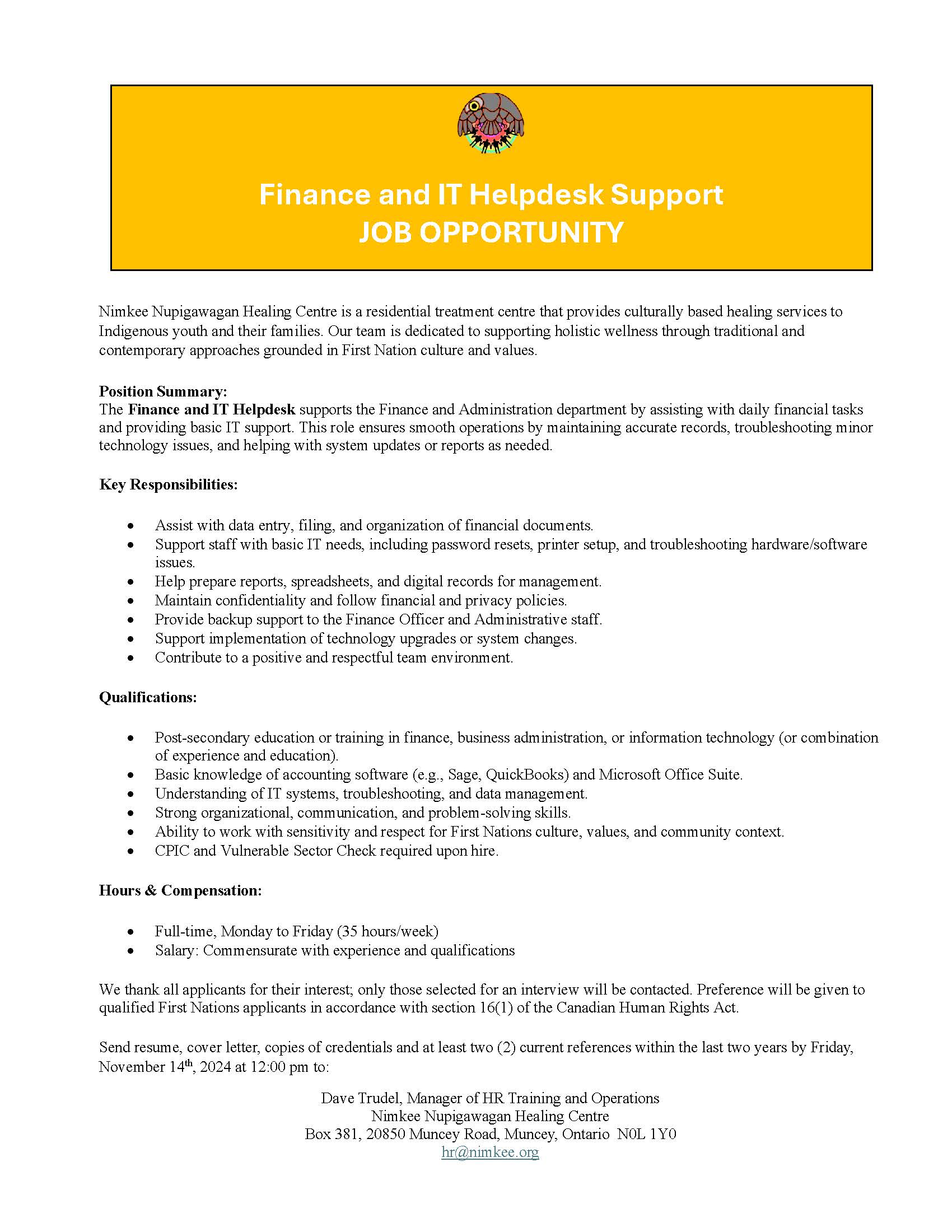 Careers Finance Officer Closing Date: Until the position has been filled Job Description – PDF Download Support Worker Closing Date: Until the position has been filledJob Description – PDF Download Curriculum Developer Closing Date: Until the position has been filledJob Description – PDF Download QA Researcher Closing Date: Until the position has been filledJob Description – PDF Download Youth Representative on Board of Directors Closing Date: October 20, 2023Job Description – PDF Download Finance and IT Helpdesk Support Closing Date: Until the position has been filledJob Description – PDF Download Land Based Cultural Helper Closing Date: Until the position has been filledJob Description – PDF Download